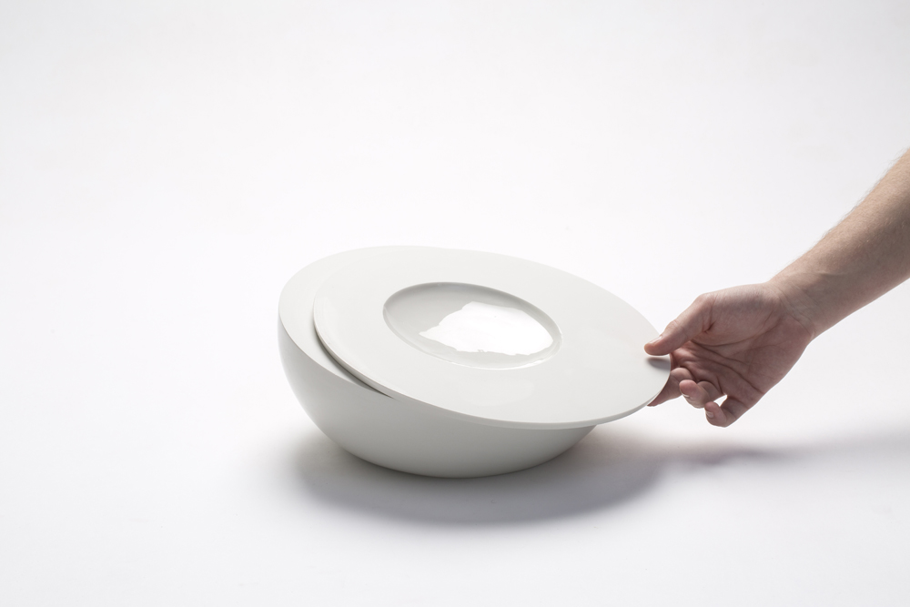 Kovács Mété hide munkája izgalmas felvetés; a „rejtőzködés – elfedés – meglepetés” témáját járja körül. Az egymásba illeszkedő gömbcikk-formák lehetőséget adnak a séfnek, hogy egymás alá rejtve a fogásokat, fokozatosan fedezzük fel azokat.