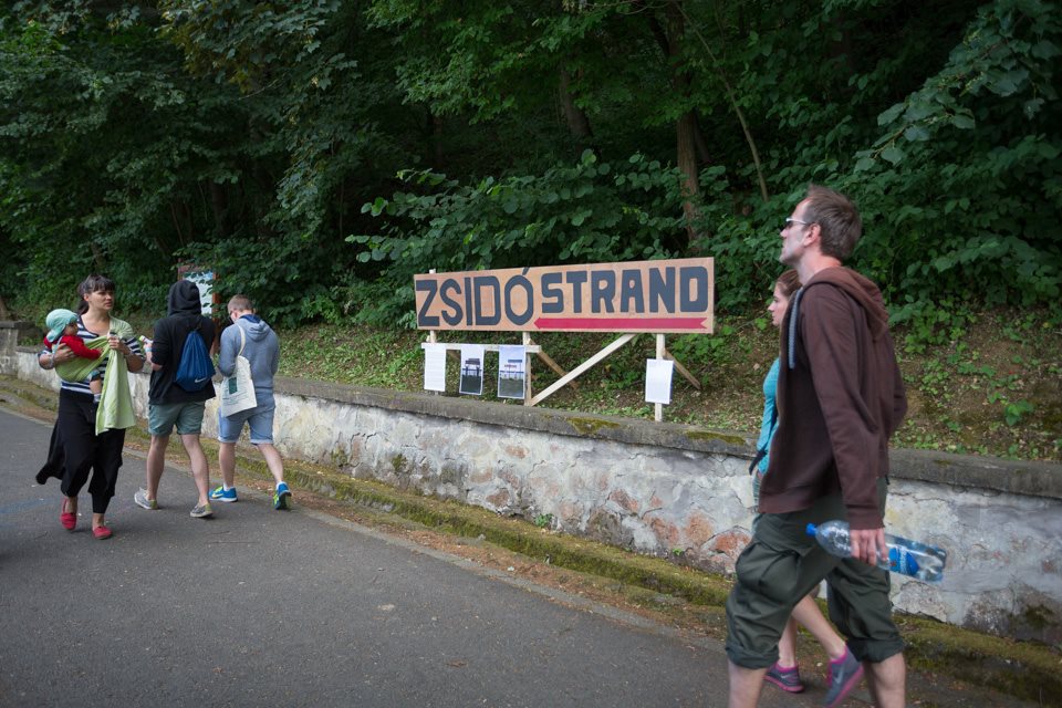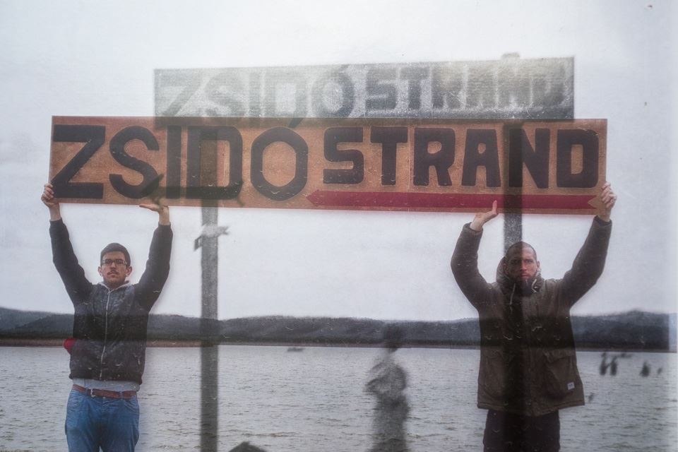 Van olyan is, ami már megvolt, de ebben a kontextusban teljesen újraértelmeződik. Közülük talán a Nemmivoltunk! Crew feat Bódi Lóránd közreműködésből a Zsidó Strandot emelném ki, amely egy talált kép remake-je, és az Enyészpontok című januári-februári holokauszt témájú online kiállításra jött létre. Ők a Fortepanon találtak egy fotót, ami 1942-43 körül, valahol a Velencei tó környékén készült, és egy óriási táblára van kiírva, hogy “zsidó strand”. Megkeresték az eredeti helyszínt, reprodukálták a táblát, amit ott újra felmutattak, felelevenítve a történteket. A tábla – az alternatív emlékmű – most a tóparti sétányon, az erdős részen van kitéve – nagyon sok embert láttam megállni előtte, elgondolkozni. Kizökkenti az embert, és ez tök jó.