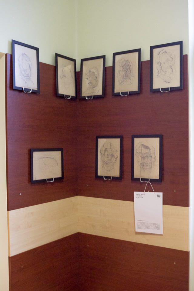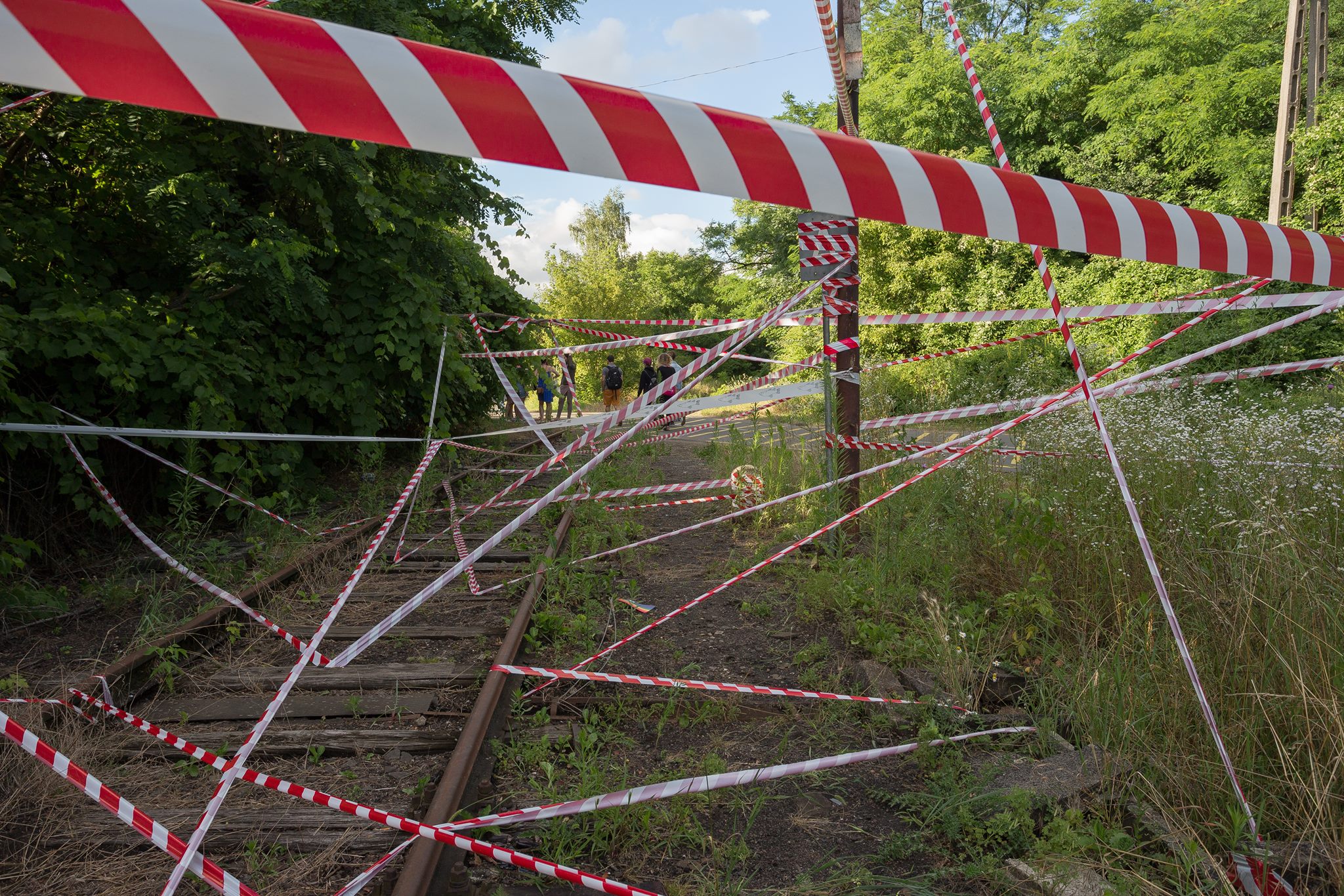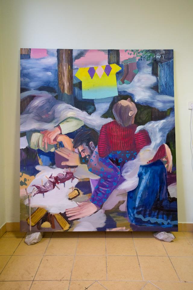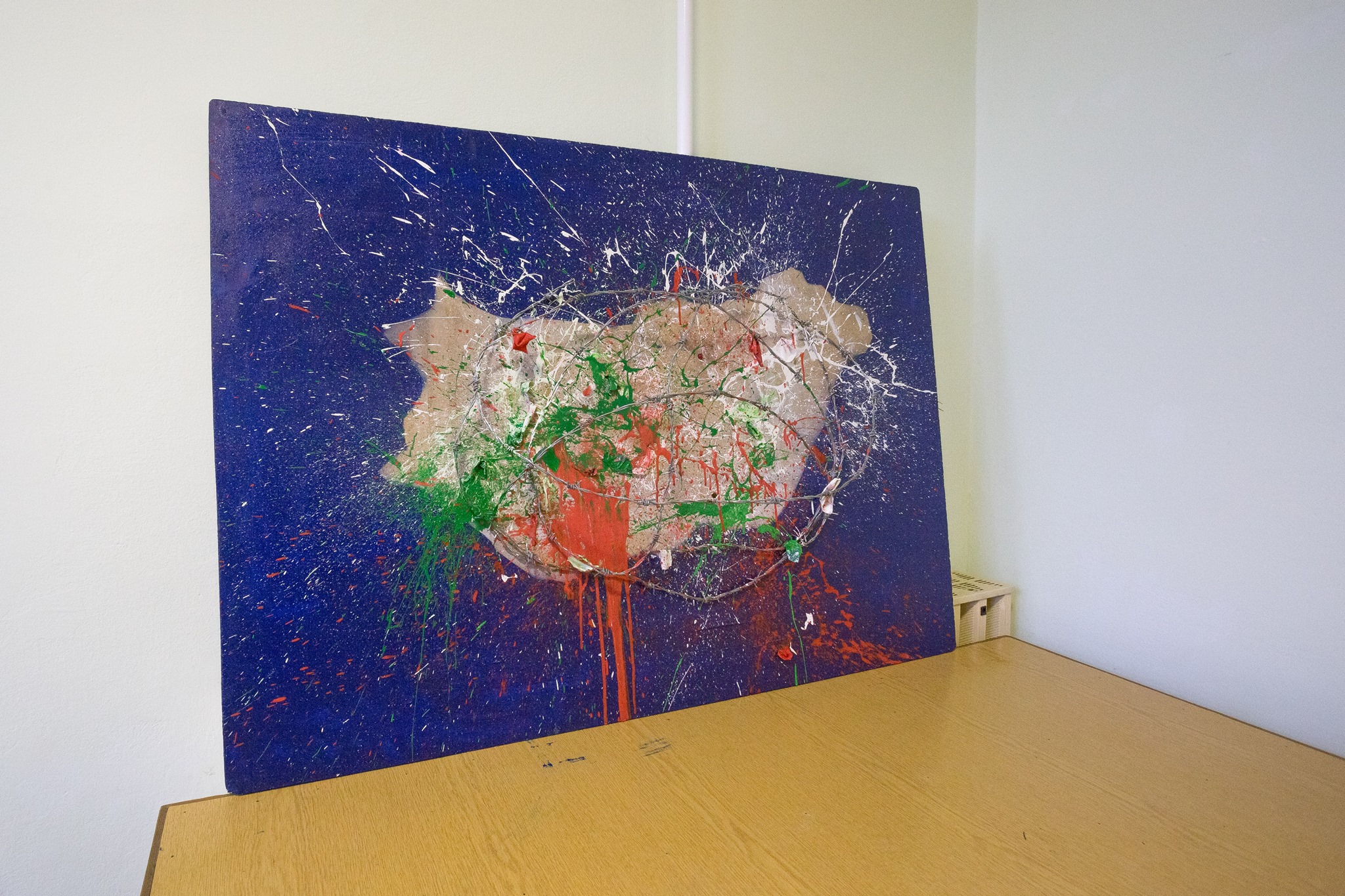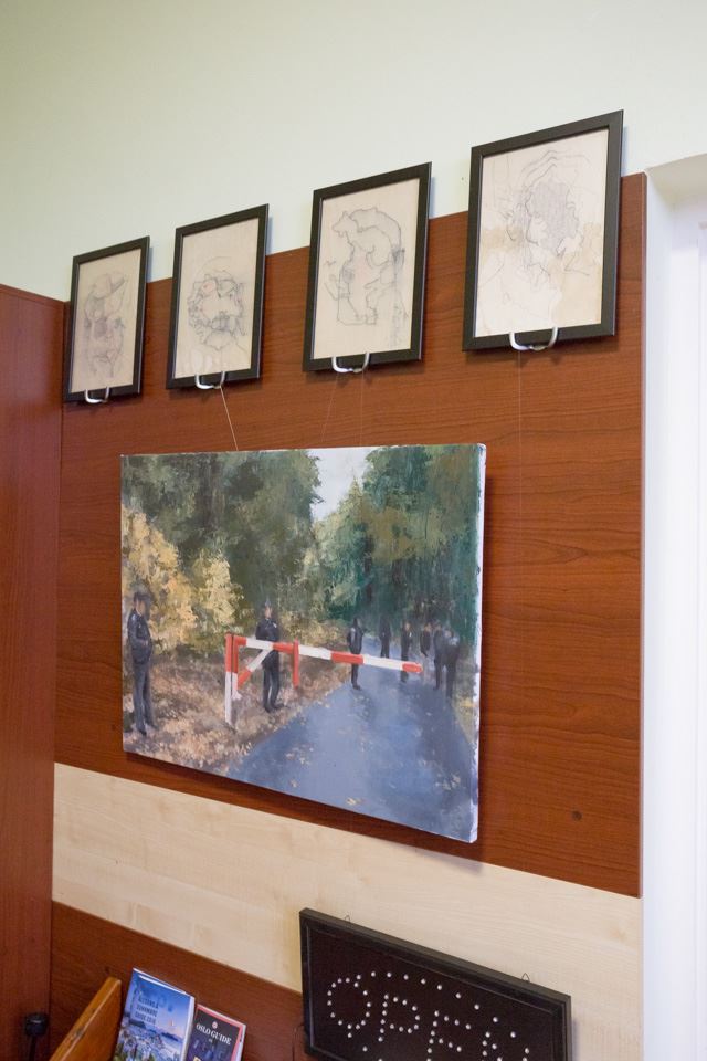 Másrészt festészetet, négy meghívott művész képeit is szerettem volna megjeleníteni: Radvánszki Levente különleges technikával készült reflexióját a szögesdrótokkal határolt országra, valamint Erményi Mátyás portrésorozatát, ahol a magyar származású tudósok, művészek, politikusok – olyan emberek, akik elhagyták az országot, disszidáltak, vagy a Magyarország mai határain kívül születtek – arcképei térképekből állnak össze. Ezer Ákos művén nem világos, hogy egy hétvégén grillező baráti társaság vagy egy poszt-apokaliptikus világ túlélő tábora jelenik meg. Végh Júlia festménye előtt szintén elbizonytalanodik a néző: nem tudod, hogy a határon innen vagy túl állsz, hogy ki hova tartozik, a kép szereplői a te oldaladra nem jöhetnek át, vagy te nem mehetsz át, egyáltalán hol a határ? Juli piros-fehér kordonszalagjai egyébként egy szabadtéri installáción, land art formájában is visszaköszönnek.