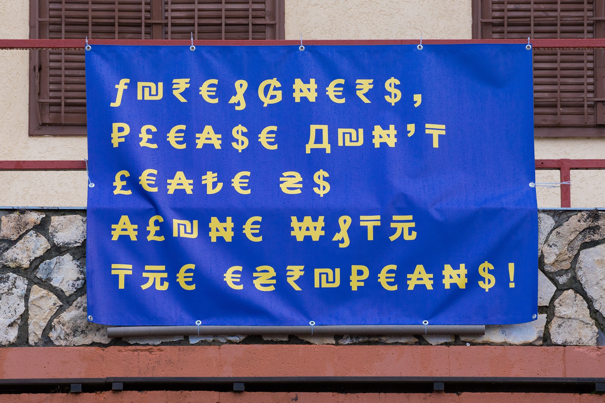 Gróf Ferencet (a Société Réaliste művészcsoport egyik tagját) is felkértem, ő két projekttel is jelen van a fesztiválon. A „Foreigners please don’t leave us alone with Europeans” a 2002-ben a narancssárga alapon feketével megjelent „Foreigners don’t leave us alone with the Danes” feliratú plakát újragondolása ez a munka – kék alapon sárgával és a nemzetközi valutajelekből kiinduló tipóval. Továbbá tart egy Világtalanok című olvasószínház előadást, ami egy 1890-es műből kiinduló, a tavalyi párizsi terrorcselekményekre való reflexió.