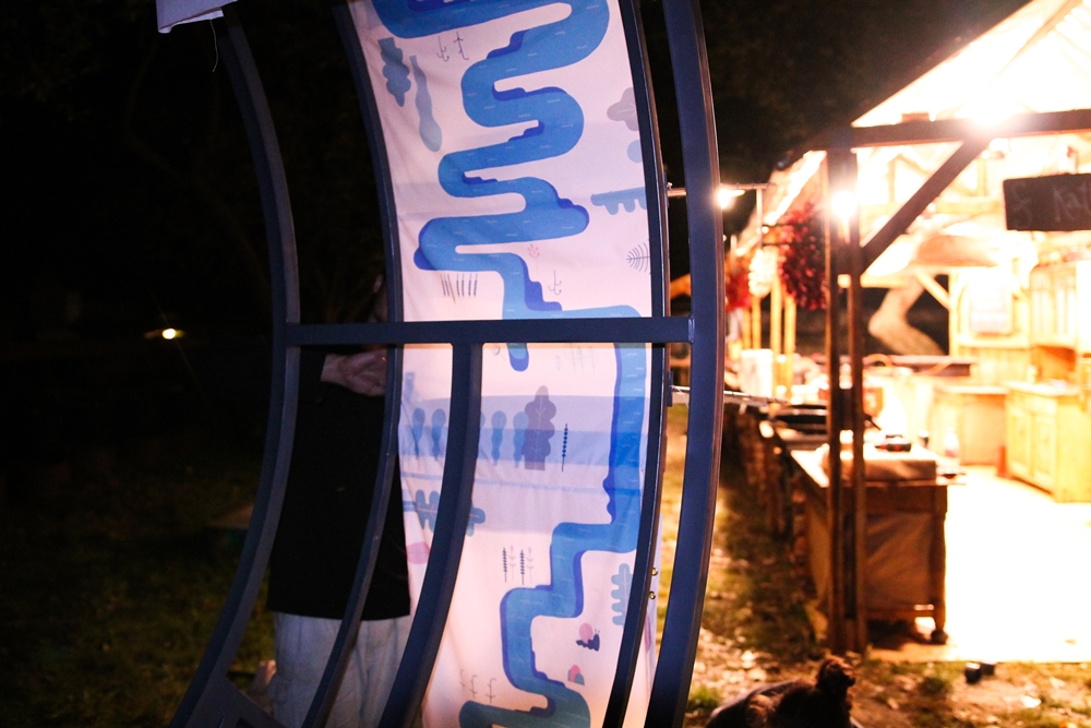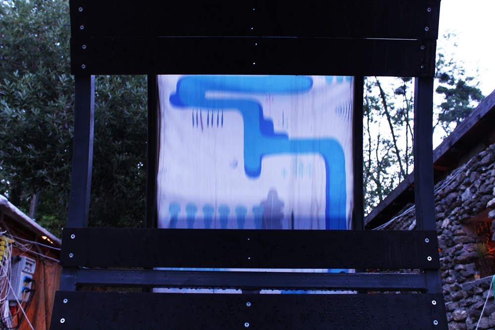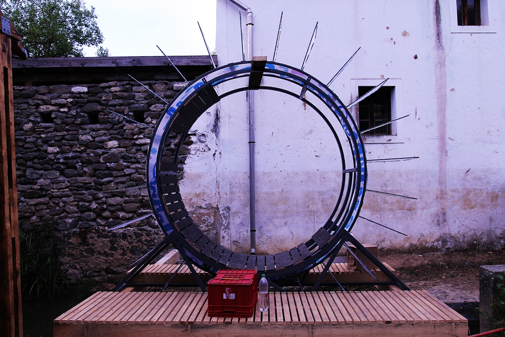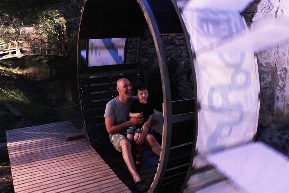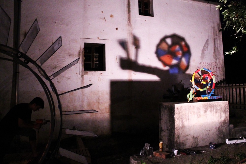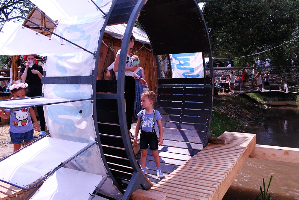 Az interdiszciplináris alkotói csapat (Bácsfai Gábor fotográfia, Gyimóthy Noémi textil, Kondor Máté formatervező, Turóczi Áron építész, Tőkés Anna és Tudisco Júlia animáció szakos hallgatók) Kapolcs legrégebbi, központi malmának ma már nem létező kerekét gondolta újra. Az eredeti funkciót átalakítva, saját tervezésű interaktív installációjukban olyan helyszínt képzeltek el, ahol a látogatók a hűsítő víz fölött ülve színes animációt tekinthetnek meg. A szerkezet egy belső, fix és egy körülötte forgó külső kerékből áll, az utóbbira erősített textil a mozikép hordozója. A kísérleti objektum az egy hétig tartó intenzív építkezés után, a gáttal felduzzasztott patak vízén valóban mozgásba lendült, melyet a fesztiválozók használatba is vettek – azt közösségi pontként, vagy a forgatagból kilépve meditatív helyszínként alkalmazva.