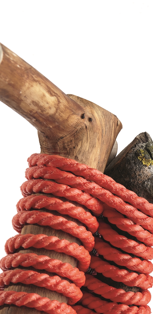 A háromlábú ülőke és a ruhafogas egy-egy klasszikus bútorarchetípust képvisel. A kollekció minden eleme egyedi, hiszen a talált faalapanyag esetenként eltérő egységeket tesz lehetővé, miközben a poli-propilén kötél és a kötéstechnika közös védjegye minden egyes darabnak.