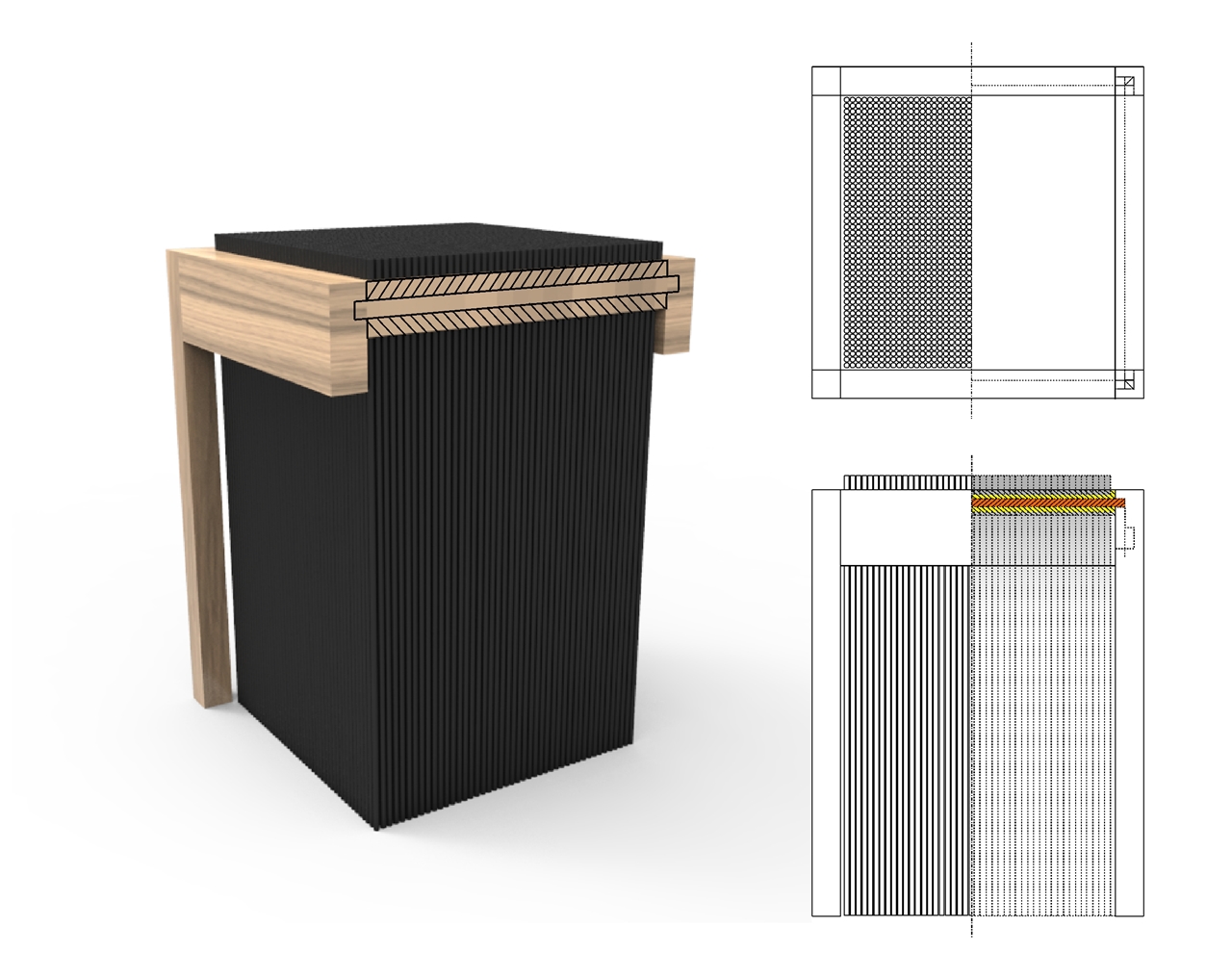 A bükk faszerkezetet mindkét esetben poli-propilén szálak egészítik ki; az egyiknél azt a hatást keltve, mintha tömbszerűen túlfutnának a szálak a fa ülőlapon, míg a másiknál, mintha az ülőfelület a szálakon állna meg. A szálak esztétikai hatásához sokban hozzájárul, hogy adott esetben mozognak, belibbennek, miközben tömöttségük révén ülésre is alkalmas felületet képeznek.