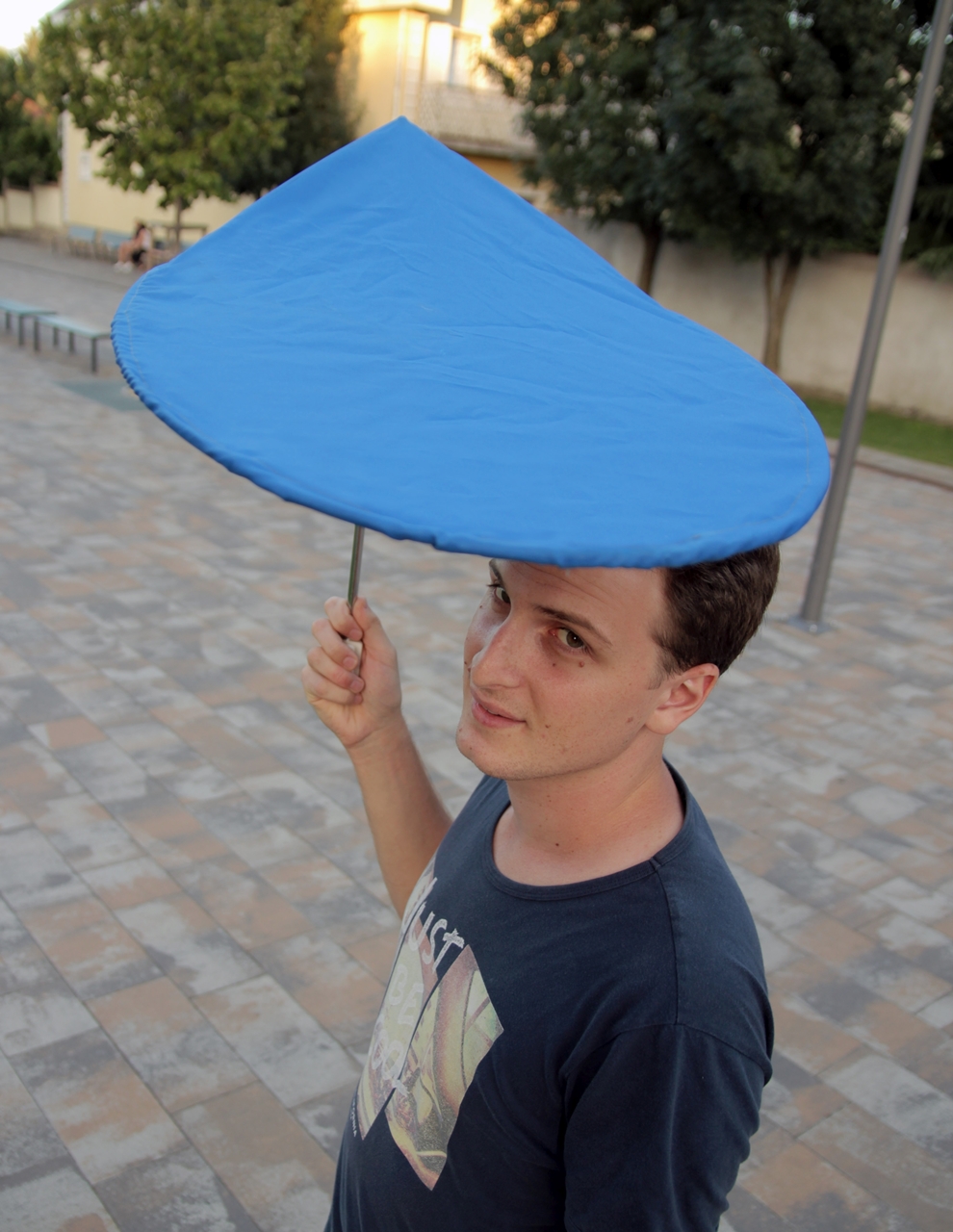 Esőben a város utcáin kit ne bosszantott volna még fel, amikor egy hatalmas és hegyes esernyőrengetegen kellett átvágnia? Miletics Attila rámutat a tényre, hogy a mai esernyők túlzó védelmet biztosítanak, lefedett területüknek ugyanis csupán 25-30 százaléka valóban hasznos. A merevítő pálcák, a textil és mozgó alkatrészek is gyakran megsérülnek vagy meghibásodnak. Egy szóval: aránytalan vesződséggel jár az esernyő.