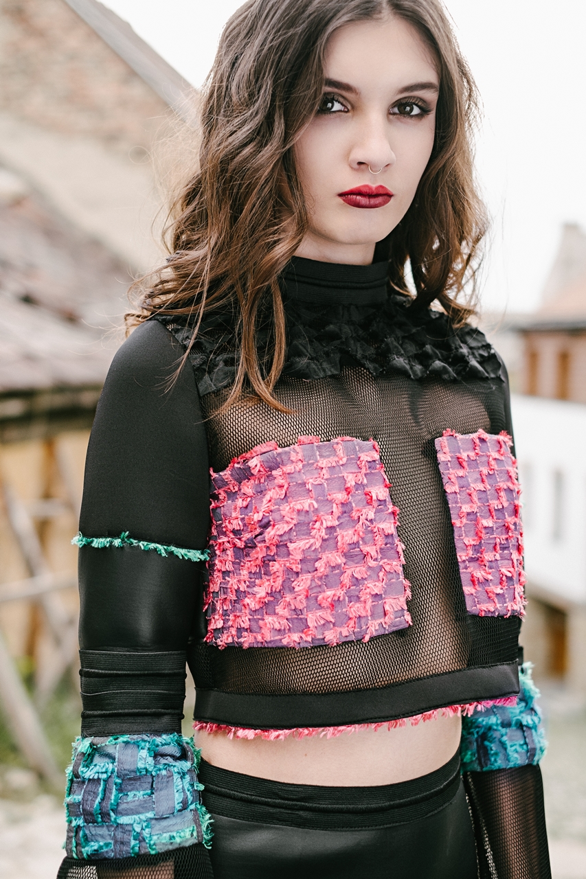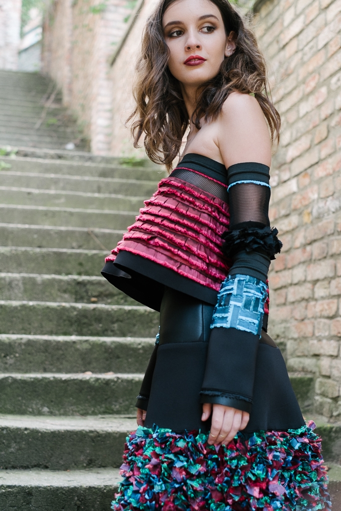 Alma már a gimnáziumban kinézte a Gombold újra! versenyét, és a rajzszakkörön már ekkor tervezett ruhákat a pályázatra, de ezekkel még nem nevezett. Tavalyi pályaművét Horváth Júliával együtt hozta létre. A feladat az volt, hogy egy kortárs művész munkásságára reflektáljon kollekciójuk és ők Oteczkit, a lengyel grafikust választották. Oteczki tűzfalra festett képeinek nemcsak színvilágát vették át, hanem a síkban megjelenített figurák öltözékeit átültették a valóságba. Különböző anyagminőségeket vegyítettek a ruházat kialakításakor: áttetsző részletekkel, mintás textíliával és lézervágott rátétekkel dolgoztak.