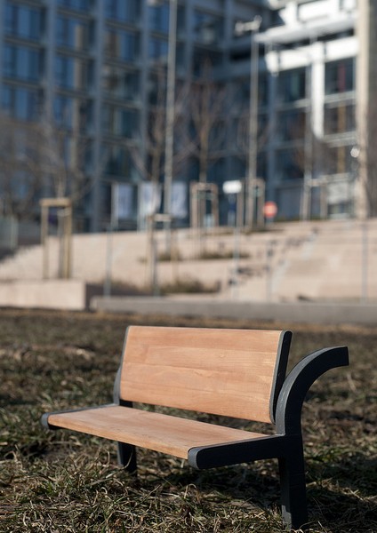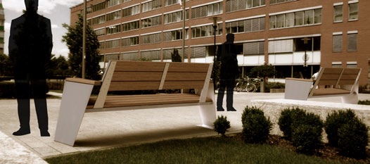 „… a cseh kubizmust idézi. Felhasználása ergonómiailag megfelelő, anyaghasználatában reprezentálja a megrendelő cég image-ét. Szempont volt a szabad gondolkodás (pad mint szobor) és a funkcionális gondolkodás (pad mint utcabútor) ütköztetése.”