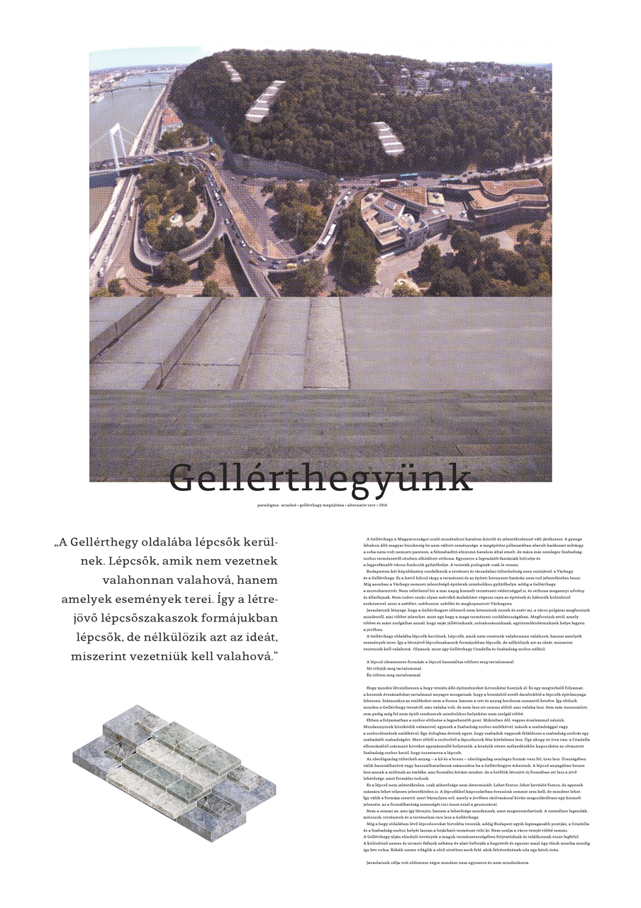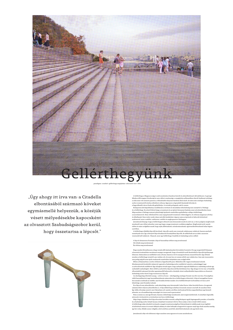 A Paradigma Ariadné építészei ennek értelmében elbontanák a Citadellát és a Szabadság-szobrot, helyükre pedig erdőt telepítenének. A hegyoldalba hatalmas lépcsősorok kerülnének, amelyekről lenézve a legjobb kiáltás nyílik a városra. A Citadella és a Szabadság-szobor formailag elvesznének ugyan, de az új lépcsősorok alapanyagaként tovább élhetnek. A koncepció szerint az egyes lépcsőfokok a Citadella köveiből épülnének fel, és azokat a Szabadság-szobor megolvasztott anyagából létrejött kapcsok kötnék össze. Az épített történelmi ballasztokkal ellentétben a lépcső a maga ideológiai semlegességében lehetővé teszi, hogy az arra járók a használat révén töltsék meg eseti tartalommal.