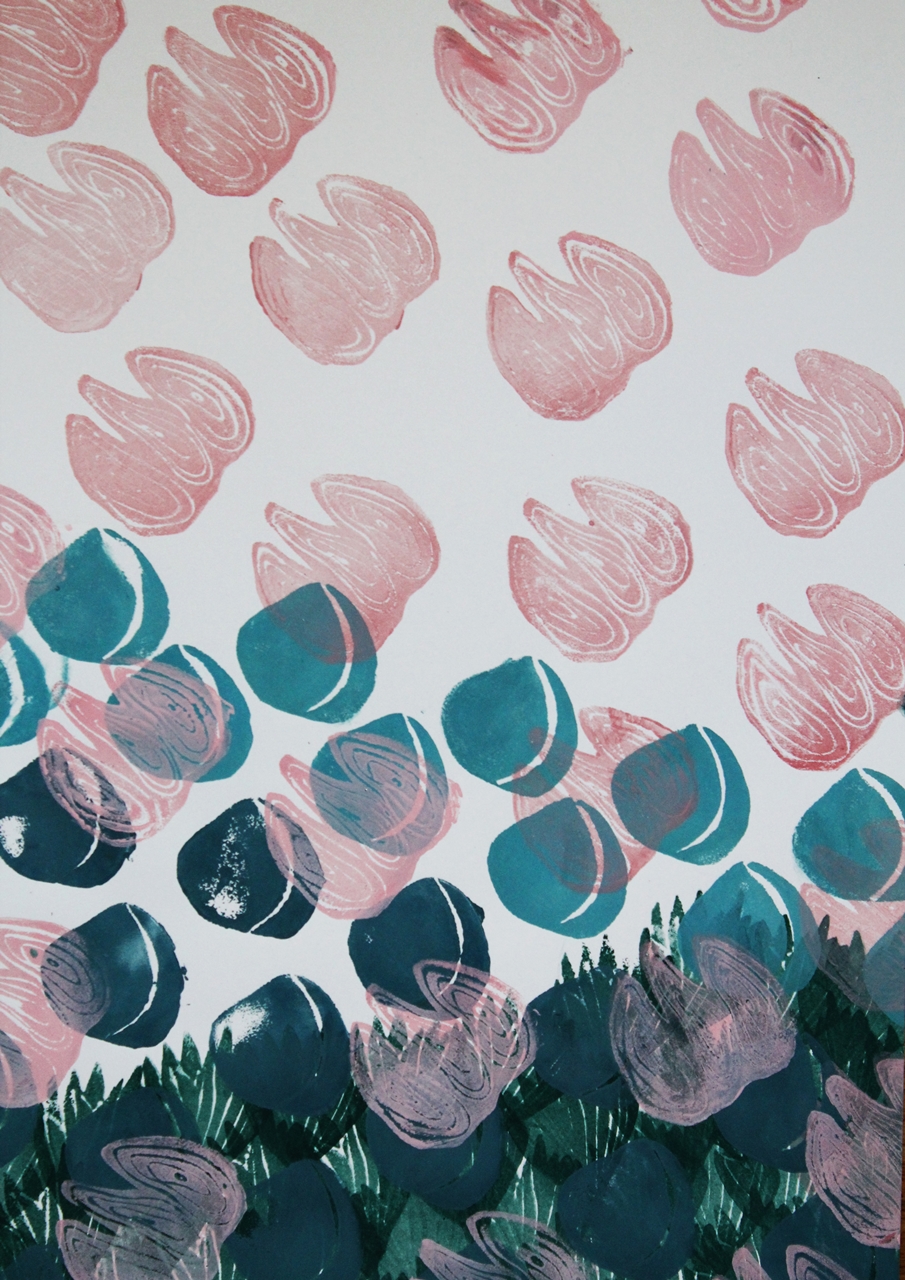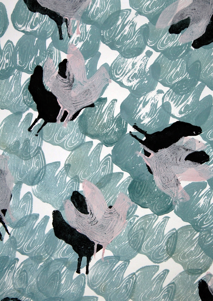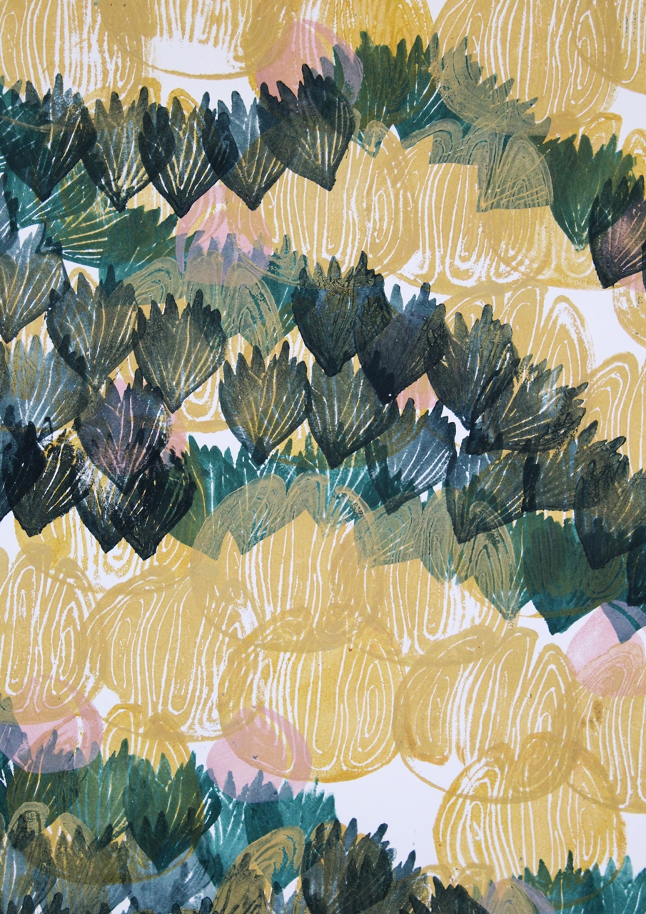 Bodnár Dorottya teraszai, Kovács Bianka csipegető galambjai vagy Váradi Lili élénk, montázsszerű munkái egy-egy városból vagy városrészből indultak ki. Tönköl Anna A levágott kezű lány Grimm meséjét idézi meg monotípiával és saját tenyerével, ujjbegyeivel készített terveiben. Velkey Virág a palóc népviseletből és motívumvilágból hozott létre nyomott mintákat, amelyeken az alsószoknyák rétegződését, egymáson való elcsúszását és mozgását jelenítette meg. László Franciska Nádja pedig a régi matyó minták elemeit használta fel, rétegelte és stilizálta – így a hagyományos motívumok modern színtrendeknek megfelelő átiratokként láthatók.
