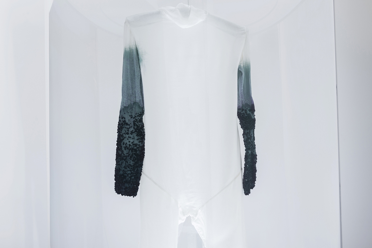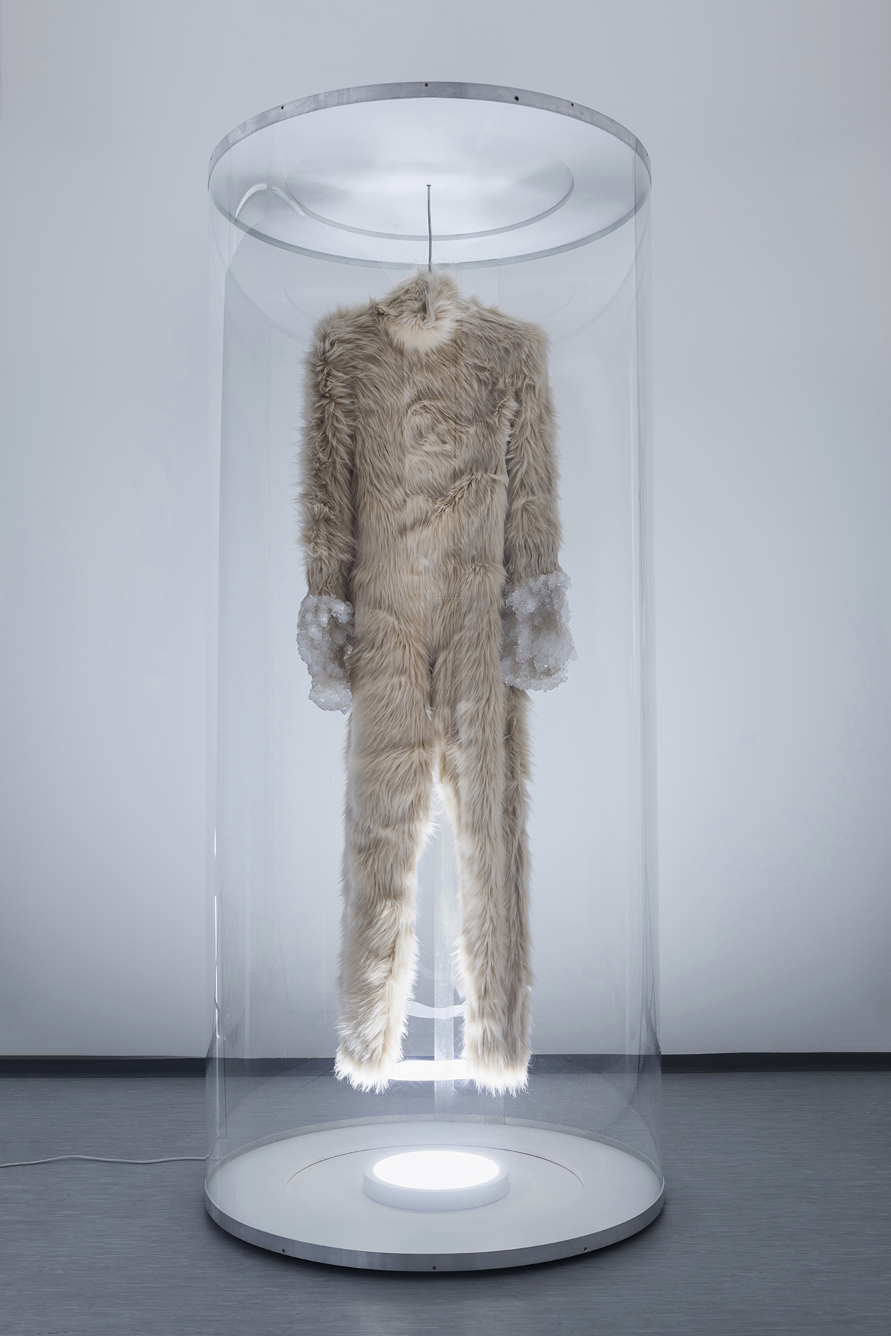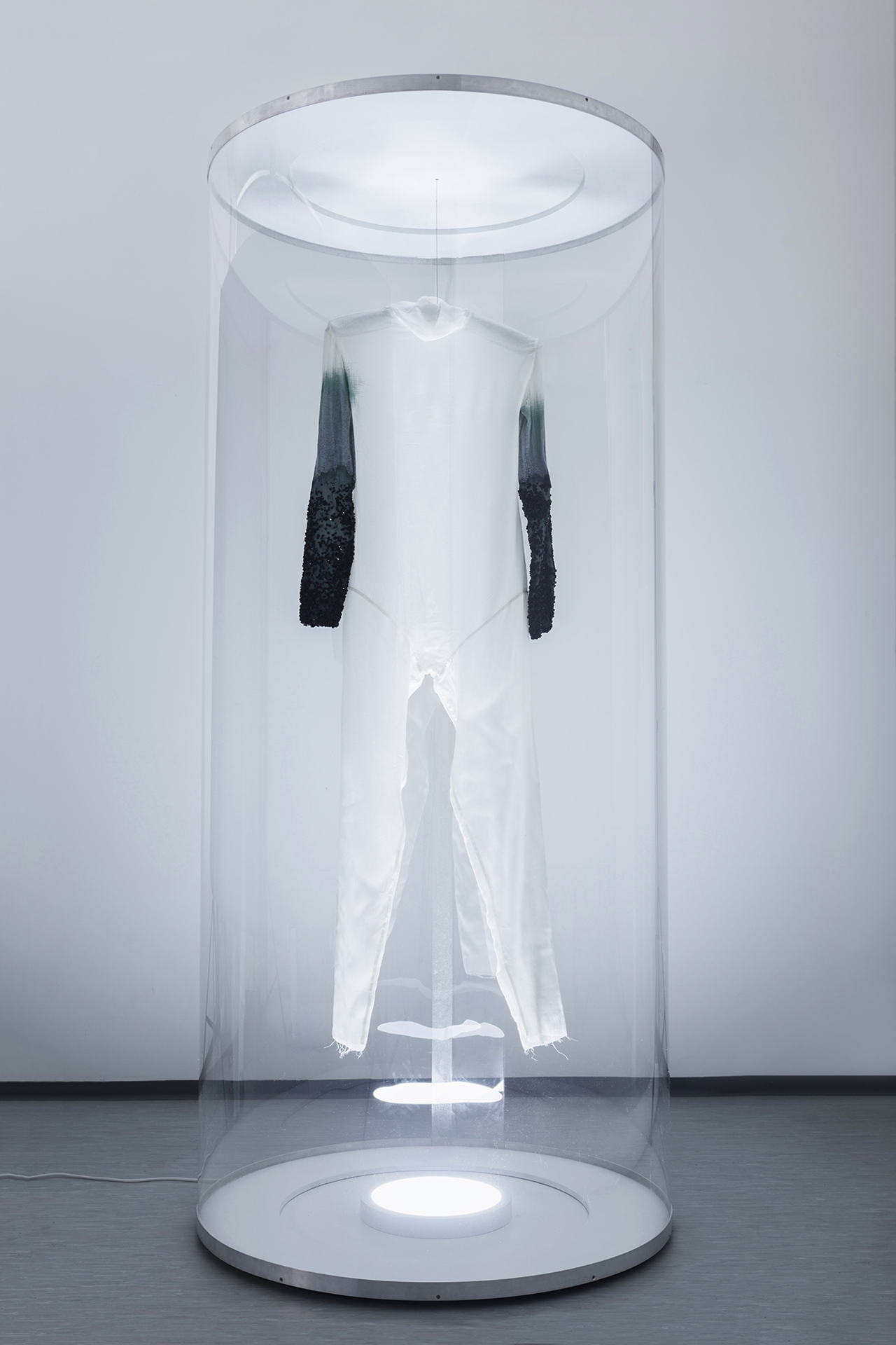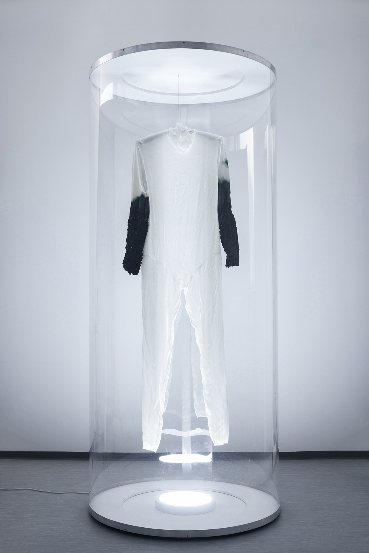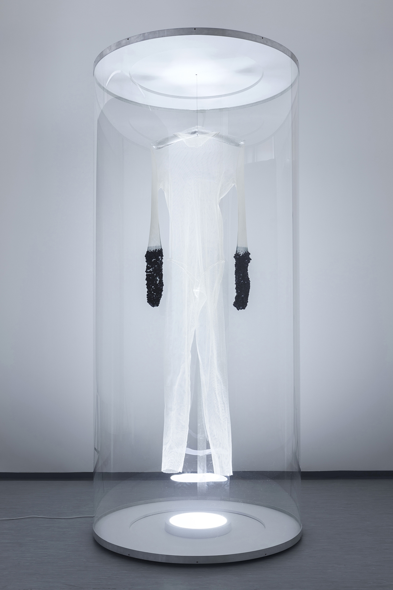 A MOME idei diplomakiállításán láthattuk azt a futurisztikus installációt, amely öt plexihengerben jelenít meg egy-egy ruhadarabot, vagy „test-tárgyat” – ahogy a tervező fogalmaz. Már első ránézésre is kívül vagyunk a divatkollekciók megszokott világán. Itt valami másról van szó, és hamar kiderül, hogy amit látunk, az konceptuális munka: tulajdonképpeni designkutatás.