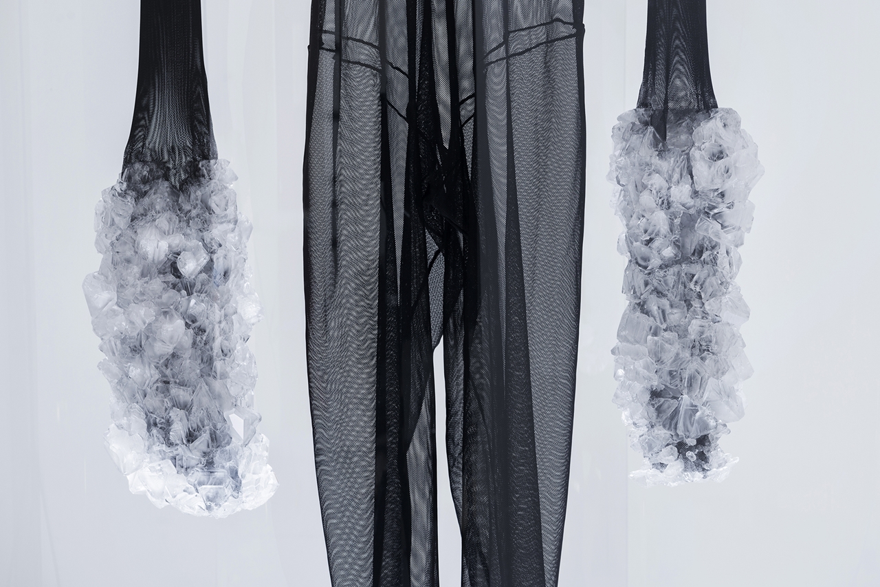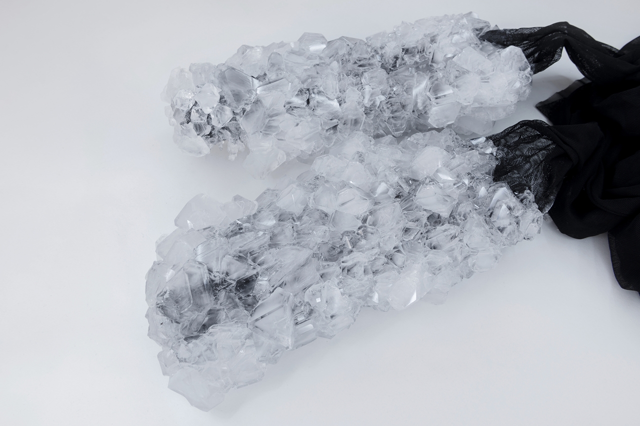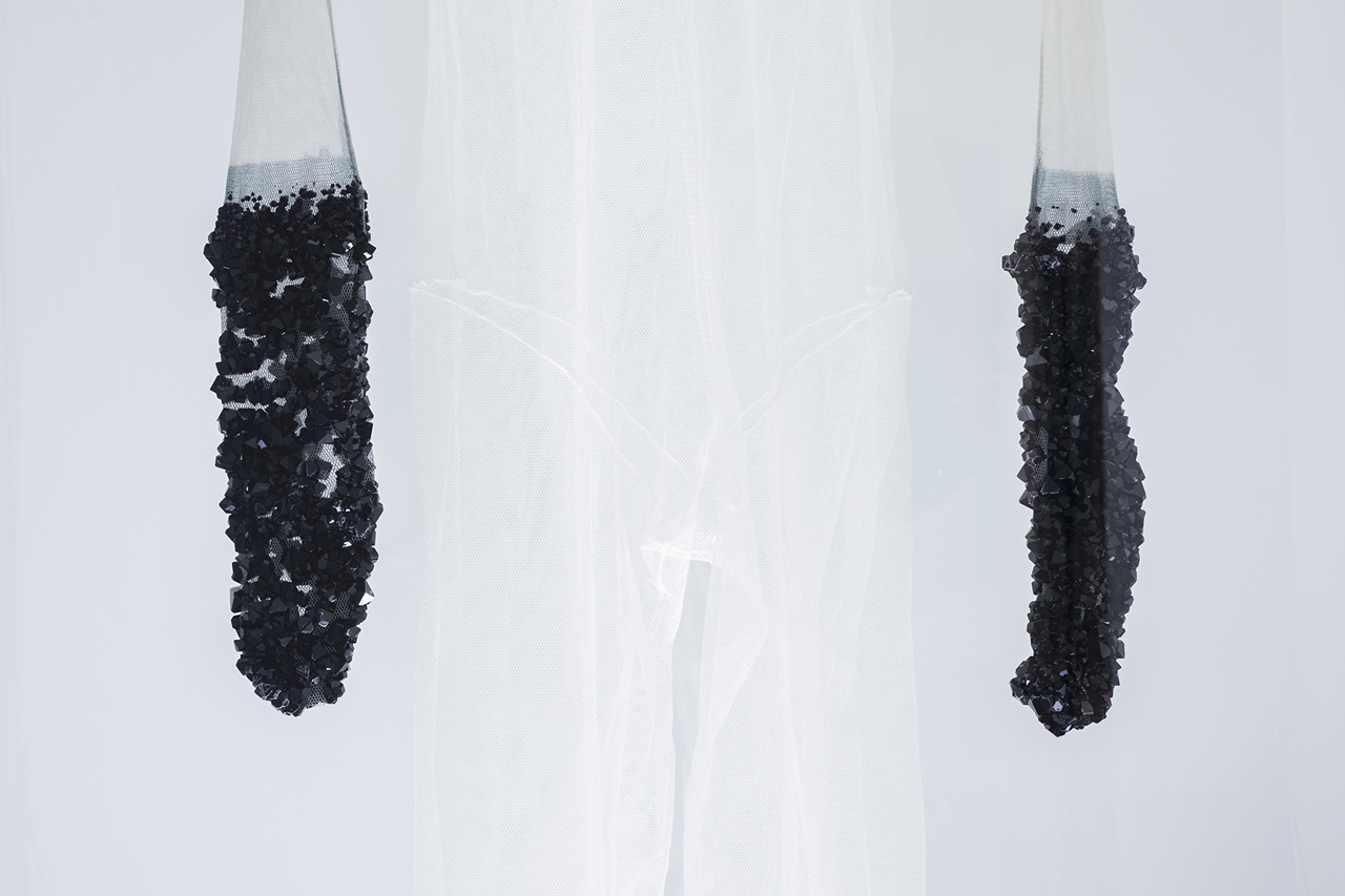 A burkok mögött stilizált testformaként jelennek a kiállított „test-tárgyak”, amelyek ötféle anyagból készültek. Elasztikus tüll, természetes pamut tüll, selyembársony, pamut géz és műszörme. Az eltérő felületű anyagok lehetőséget adnak a kristályképzés többirányú kivitelezésére, hiszen ugyanaz a kémiai folyamat teljesen eltérő eredményre vezet a különböző anyagok esetében.