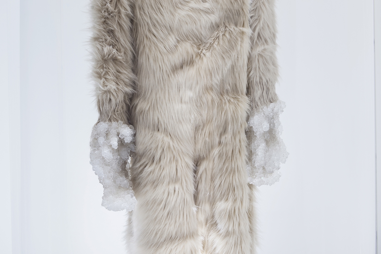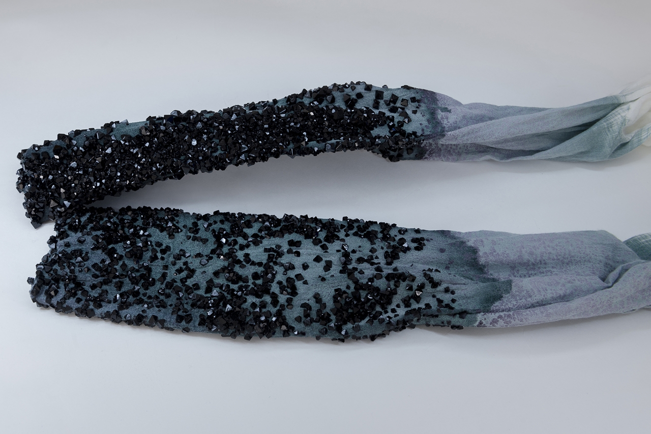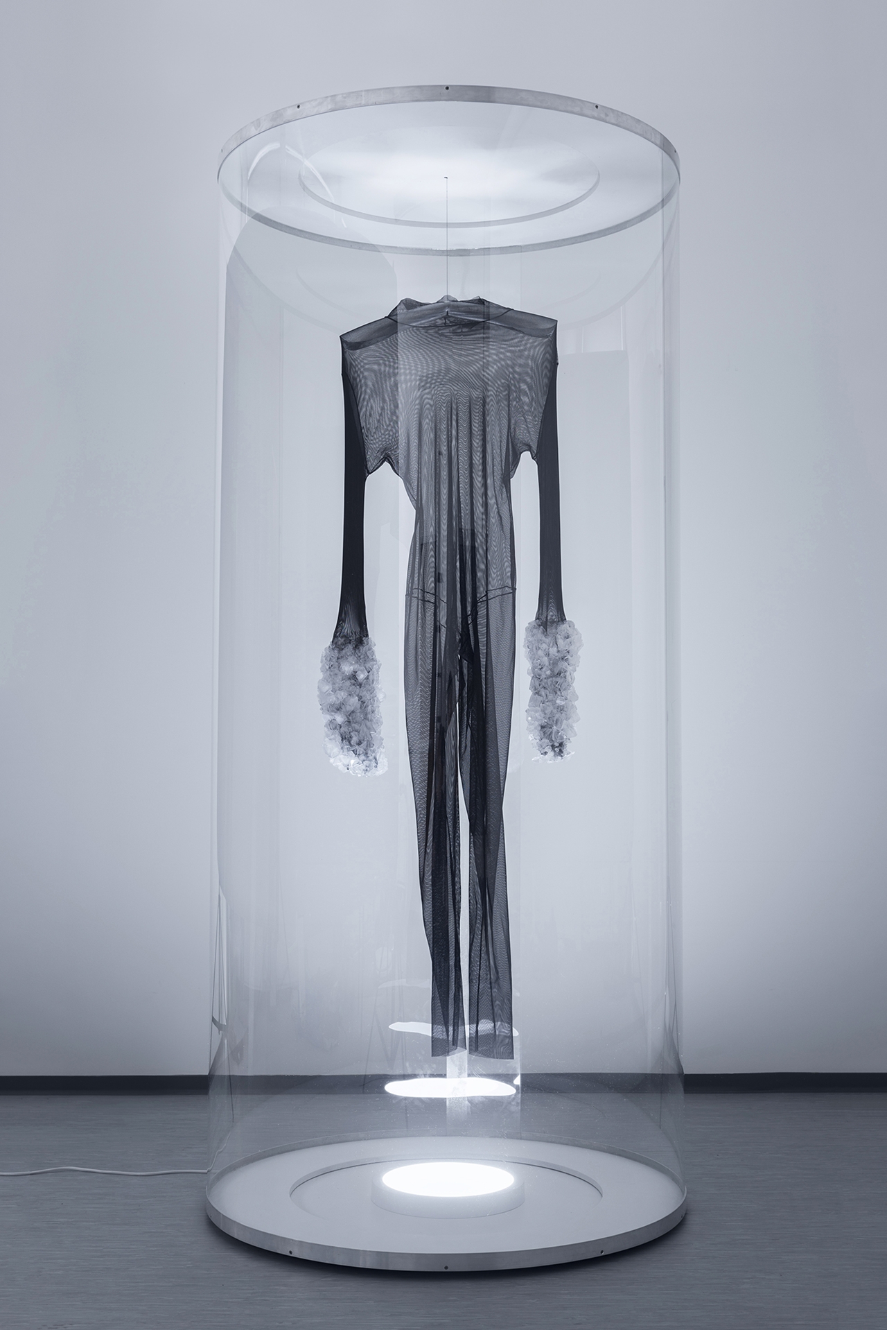 A burkok mögött stilizált testformaként jelennek a kiállított „test-tárgyak”, amelyek ötféle anyagból készültek. Elasztikus tüll, természetes pamut tüll, selyembársony, pamut géz és műszörme. Az eltérő felületű anyagok lehetőséget adnak a kristályképzés többirányú kivitelezésére, hiszen ugyanaz a kémiai folyamat teljesen eltérő eredményre vezet a különböző anyagok esetében.