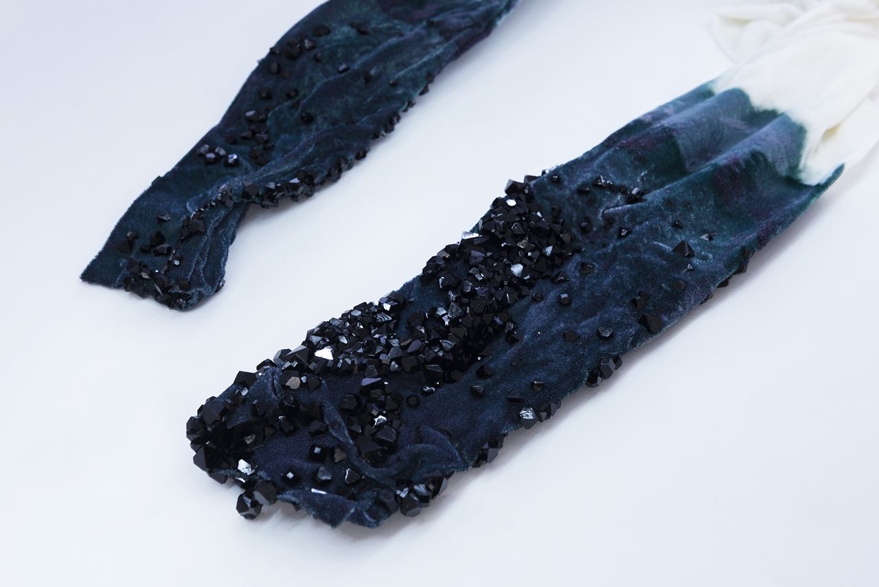 A véletlen szerkezetét tárja fel Vass Csenge Virág divat- és textilszakos mestermunkájában. Olyan felületeket hozott létre, amelyek a kristályosodás jelenségére építve teret engednek a spontán átalakulásnak.
