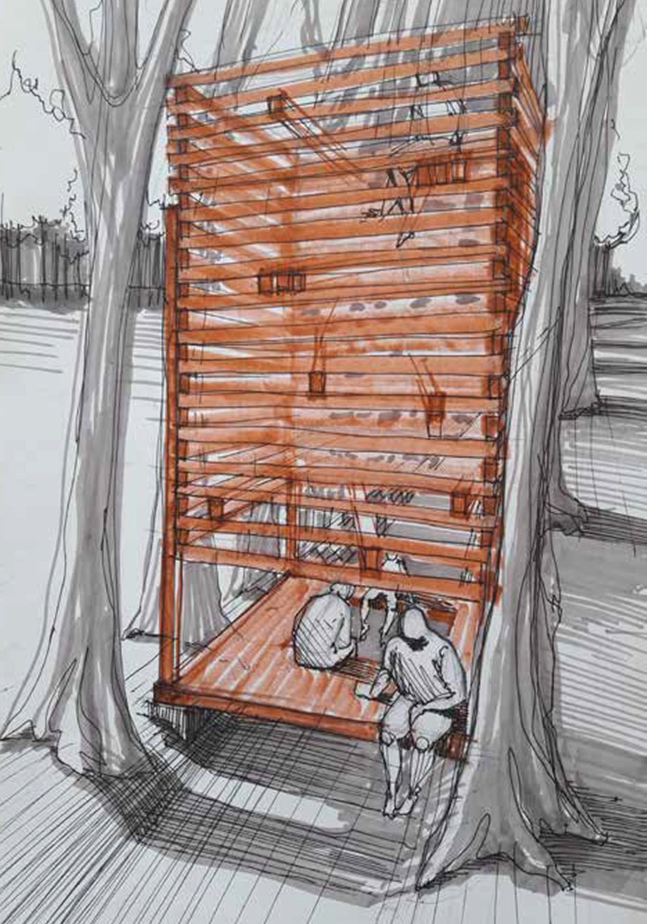 A faépület szimbolikus kapcsolatot teremt az alatta futó patakkal, és a szerkezet belsejében található kút révén közvetlenül is érintkezik a vízzel. A cél egy olyan építészeti alkotás létrehozása volt, ami vizuálisan a tájba illeszkedik, formailag pedig a kádárság hagyományaira épít, így az erdőbényei kultúra szerves részévé tud válni. Ráadásul az építmény kisebb társaságok befogadására is alkalmas, fel lehet rá mászni, vagy hűsölhetünk a belsejében.