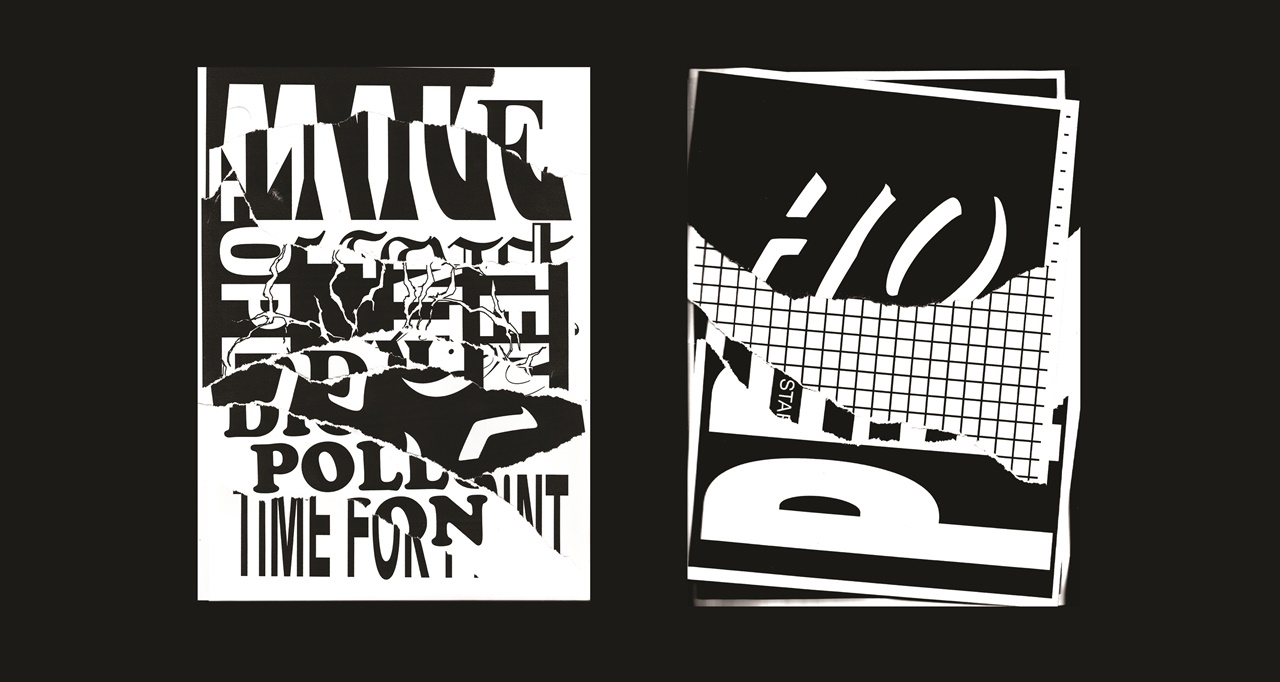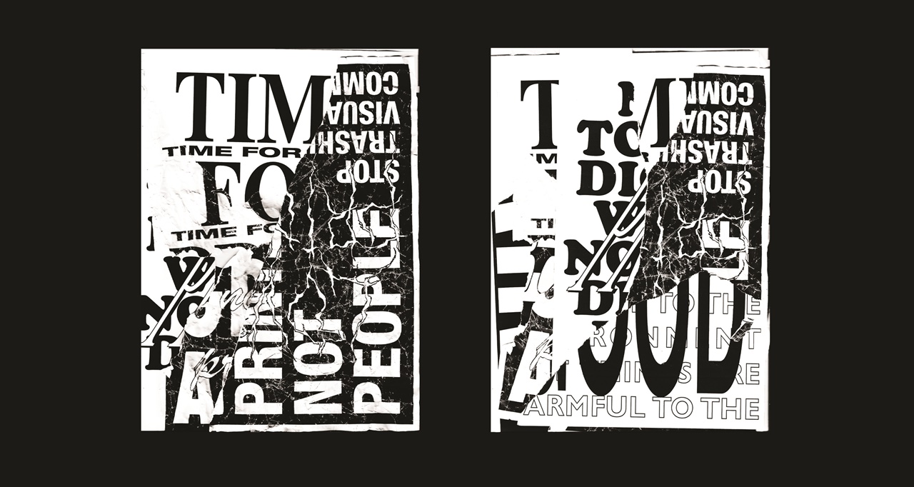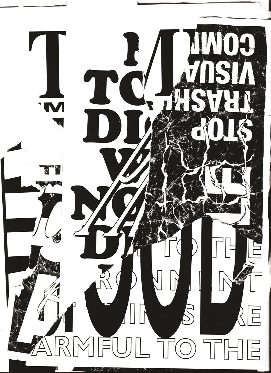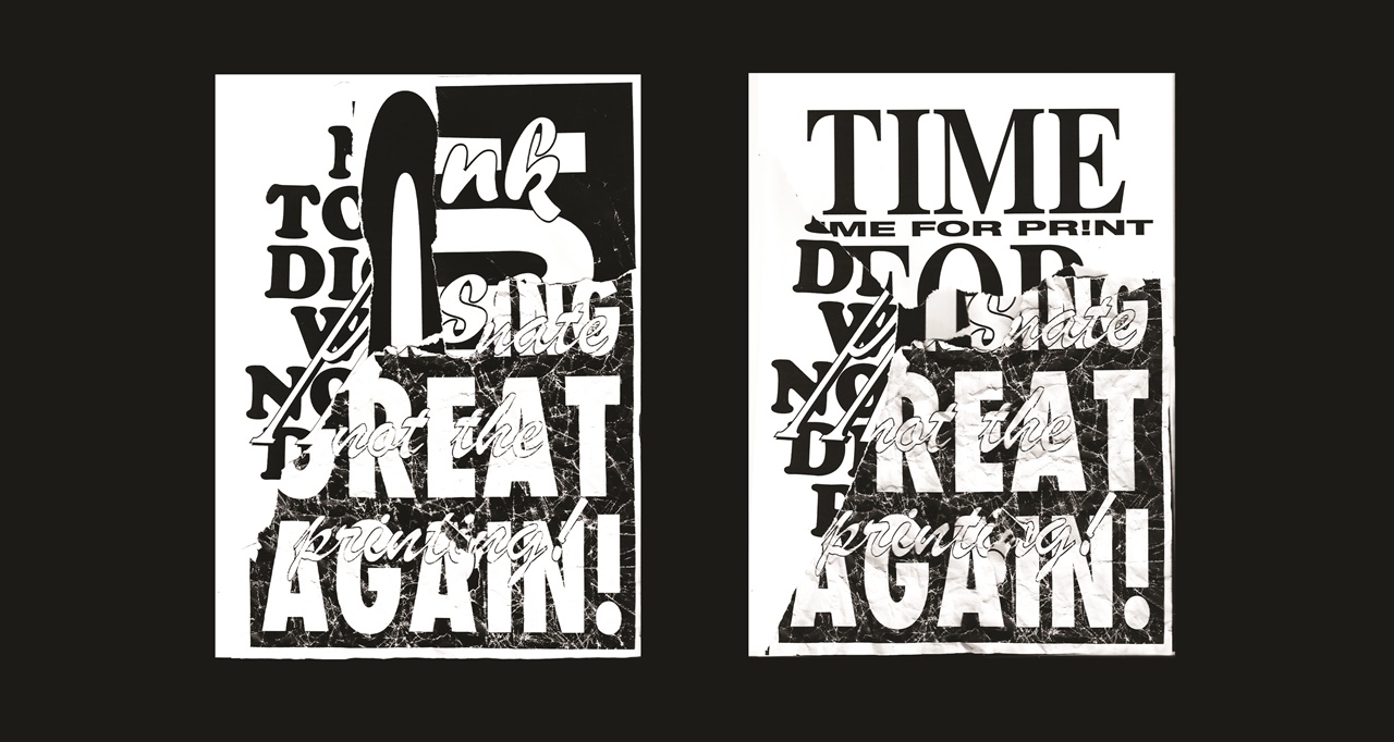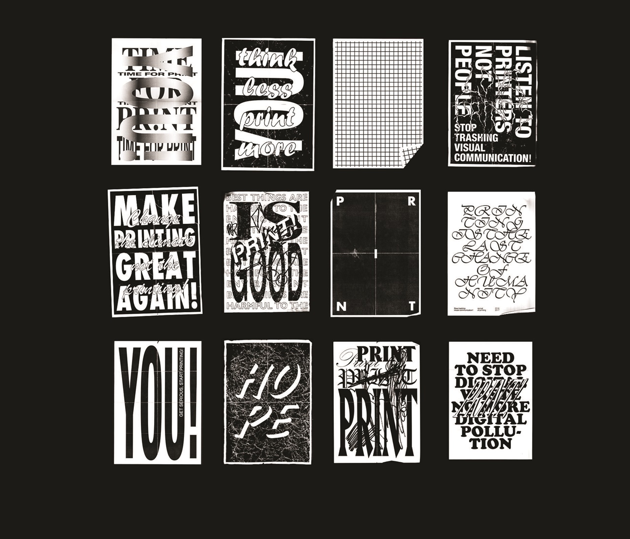 A közeterken osztogatott flyerek elemeiből építkező poszterek a fénymásolástechnikát alapul véve propagálják az olcsó nyomtatványok melletti kiállást az online látvány-túladagolással szemben.