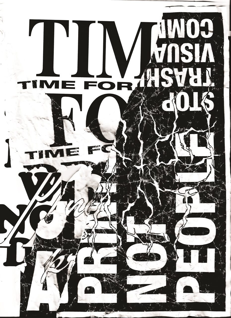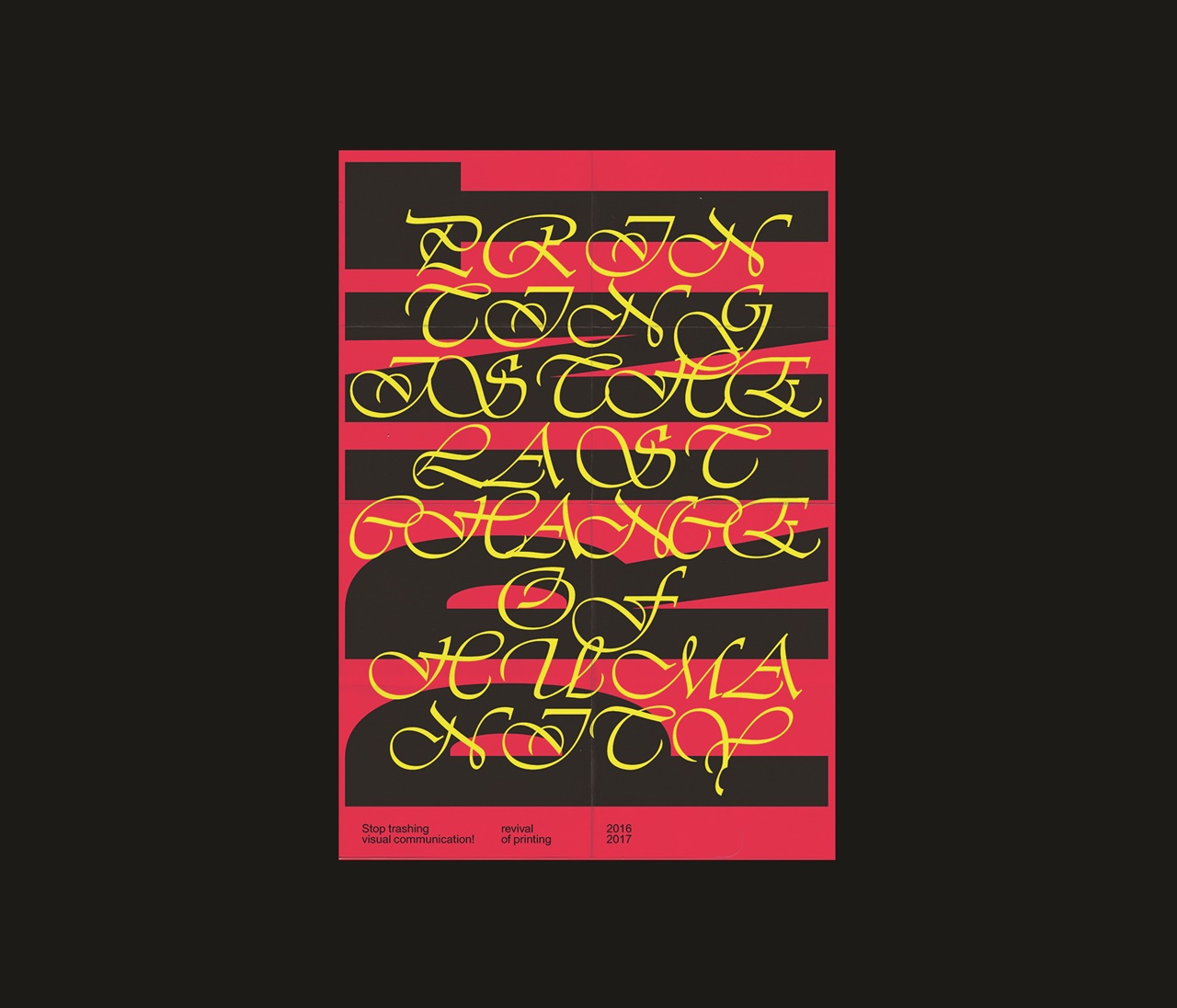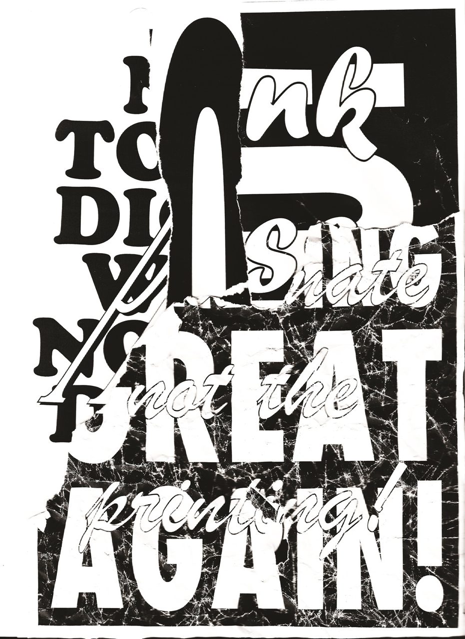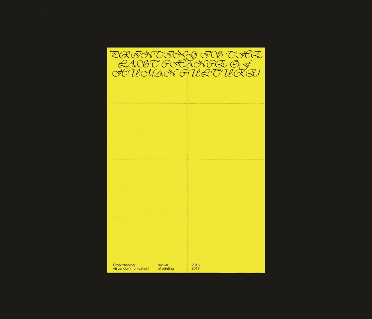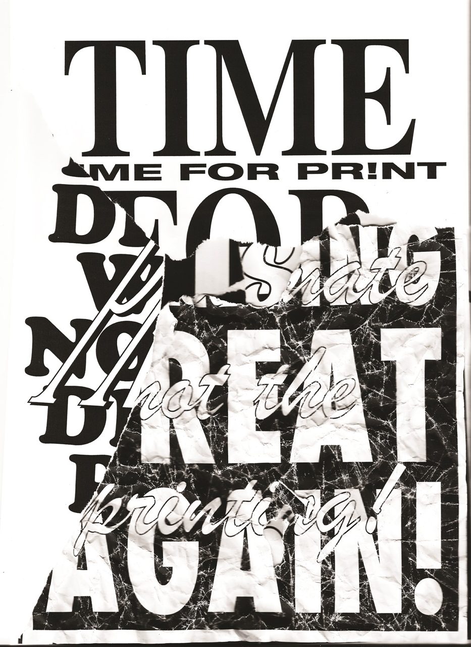 A közeterken osztogatott flyerek elemeiből építkező poszterek a fénymásolástechnikát alapul véve propagálják az olcsó nyomtatványok melletti kiállást az online látvány-túladagolással szemben.