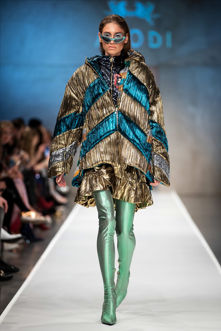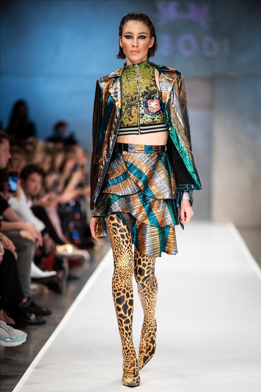 Az első nap lezárására tartogatott ABODI show magasra tette a lécet. Nemcsak a lehengerlő ruhákkal, de a prezentálás módjával is. A 90-es évek hangulatát idéző öltözékekben felvonuló modellek az Emergency House technojával rázták fel a közönséget. A diszkógömbként csillogó szettek a századforduló előtti Los Angeles hangulatából merítve fogalmazzák újra a jelen nőképét: a tűsarkú combcsizmák nyers szexualitásának és a farmer anyagok keménységének találkozása tiszteletet parancsoló, erős és lenyűgöző dívákat mutat be. Mindemellett nem veszik el a könnyedség sem, több helyen apró fodrok lágyítják az összhatást. A bohém kollekció Abodi Dórát másnaposan megpillantott, napfényben fürdőző gyíkokra emlékezteti – nyilatkozta a Fashionistának –, ez a vízió pedig jó adag humort hordoz magában.
