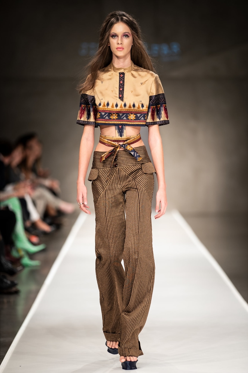 Teltház előtt mutatta be a Totem nevet viselő, távoli kultúrák szakrális jelképeiből, többek között az ókori Egyiptom szimbólumaiból is építkező kollekcióját Sándor Szandra. A Nanushkára jellemző egyszerű szabásvonalak ezúttal is egy igazán hordható és kényelmes viseletet teremtenek, natúr és homokszínei a fülledt egyiptomi nyarat idézik. Nanushka gazdagon használja az idei őszi-téli kollekció meghatározó elemét, az állatmintát – ami a tavaszi-nyári trendben is megmarad még –, valamint nagy hatással van rá a western stílus is, ezen keresztül csempészi vissza a divatból eddig száműzött erszényt és övtáskát is. A krémszínek mellett feltűnik az élénk ciklámen szín is, ami szaténnadrágon, virágmotívumos kimonón megjelenve a keleti kultúrkört is bevonja.