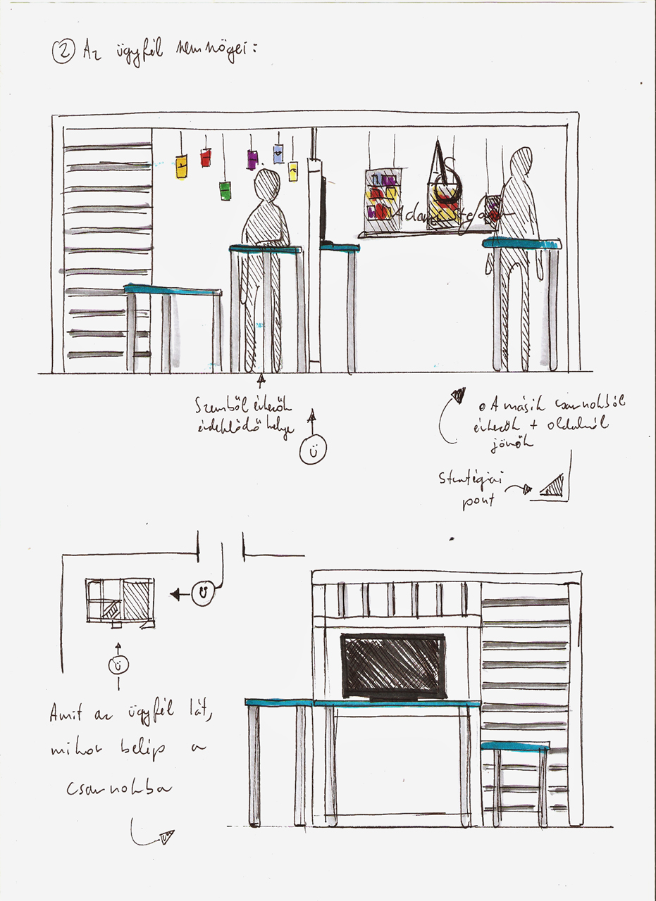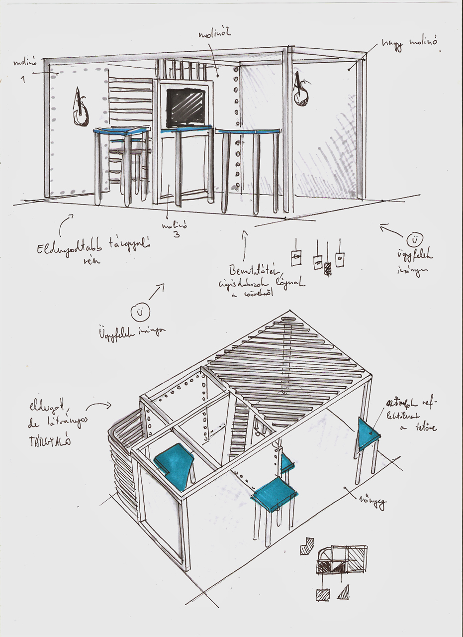 Bár a standtervezés feladata ismeretlen terep volt számára, már az ötletek szintjén is egy dinamikusan kommunikáló, tervezett tér gondolatát vázolta fel, melyben mind az alapanyagok, mind a formák összecsengenek a cég arculatával és termékkínálatával. A tervezés két hónapot, a helyszíni kivitelezés azonban – az előzetes összepróbálásnak köszönhetően – csak egy napot vett igénybe. Lényeges szempont volt ez utóbbi során, hogy csak jó minőségű, tartós anyagok legyenek felhasználva.