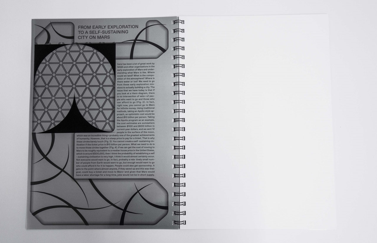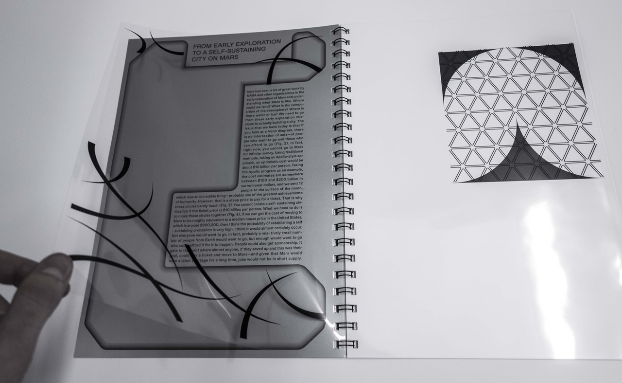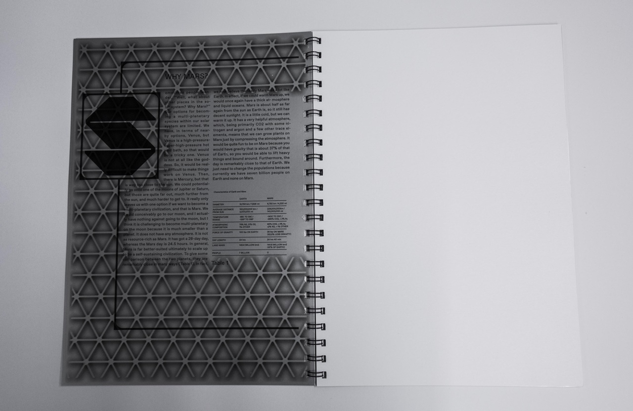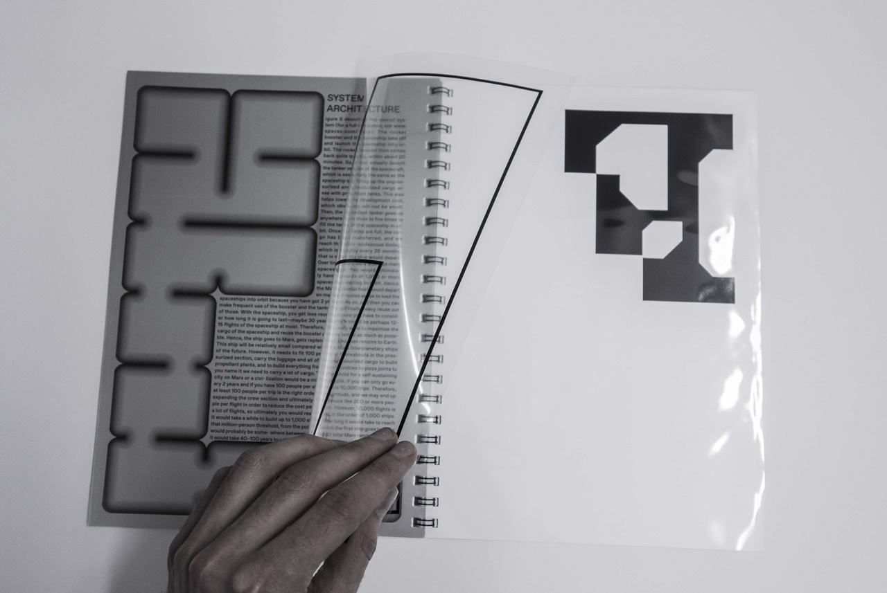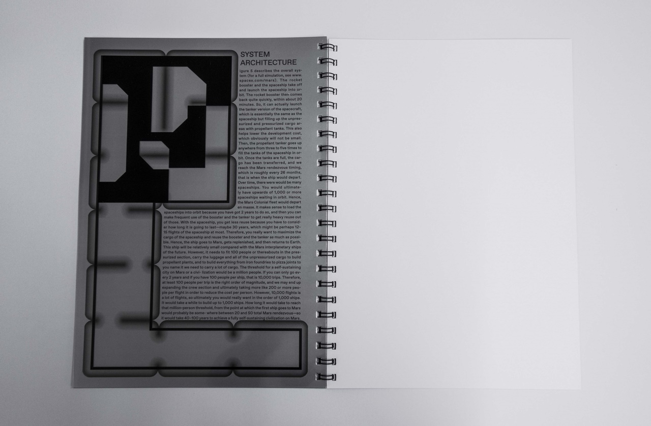 A vizuális átírás alapgondolata a technológiai eszközök és környezet grafikai leképzésén, majd a kódex statikus rendszerébe való behelyezésén alapult. A tervezés a SpaceX valamennyi járművére, de főként a BFR (Big Falcon Rocket) kolonizáló csillaghajóra fókuszált. A Marsra utazók a kolonizációs program szerint ebben a rakétában tartózkodnak majd 8 hónapon keresztül, mielőtt elérik a vörös bolygót – a grafikai tervben éppen emiatt a kitüntetett szerepe miatt jelenik meg fő formai inspirációs forrásként.
