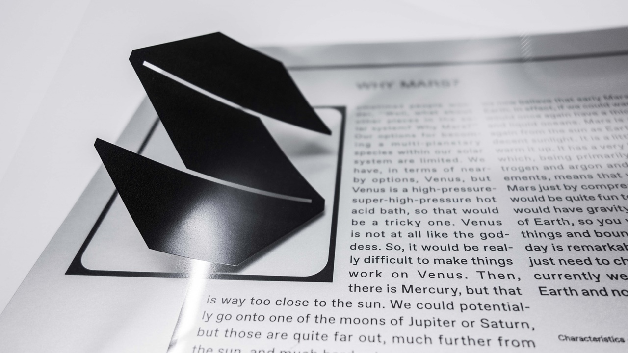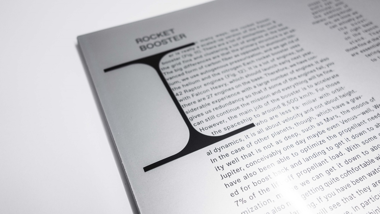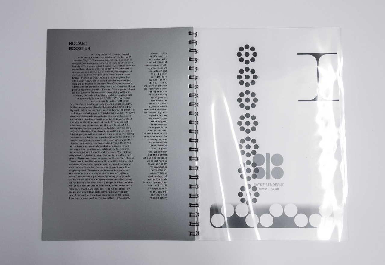 Maga az űrrakéta formailag nagyon sokszínű: erősen geometrikus, kontrasztos, a fehér és a fekete közti árnyalatok váltakoznak benne; egyszerre dinamikus és statikus, mesterséges és organikus formák jellemzik. A tervező ezeket az elemeket emelte át díszítésekként a kiadványba.