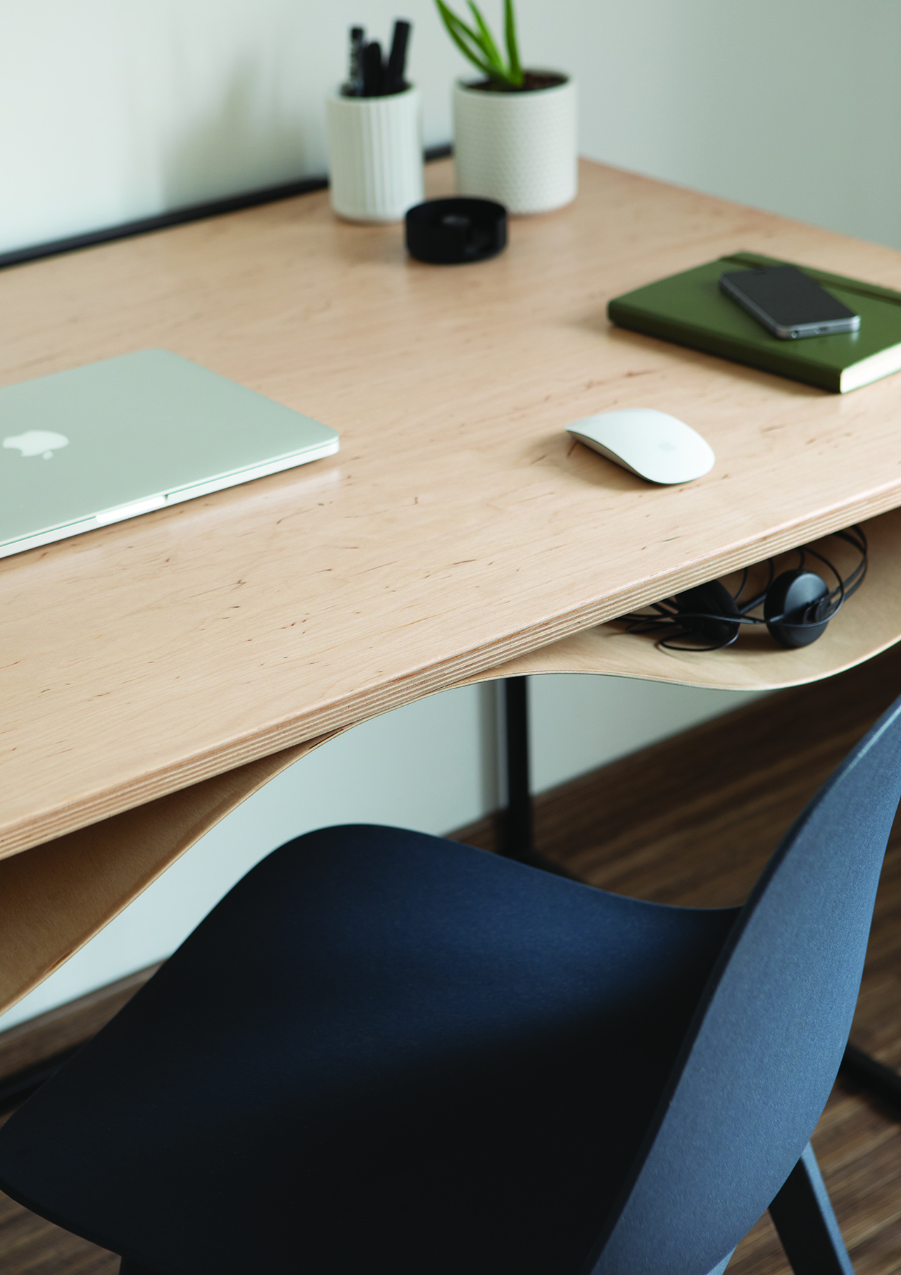A kiállítás harmadik és egyben utolsó bútorterve a minimalizmus jegyében született. Aligha van egyszerűbb és praktikusabb bútor az asztalnál, talán pont ebben az egyszerűségben rejlik a tervezői kihívás. Kovácsik Bence rétegelt lemezből alkotta meg moduláris felépítésű íróasztalát, a lehelet vékony hajlított lemezzel játékosan töri meg a bútor szögletes formavilágát.