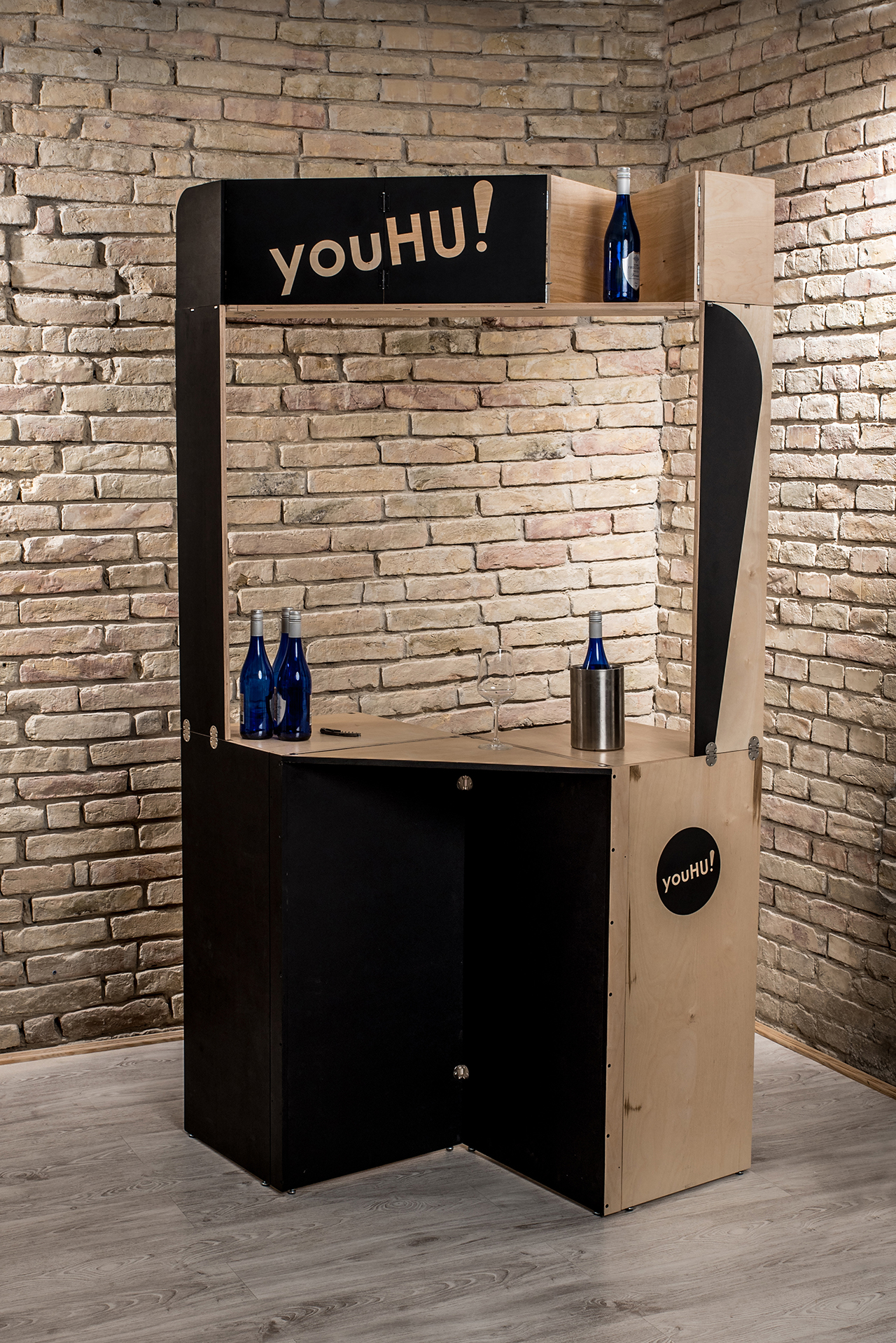 A kikapcsolódásnak és a kultúrának, különösképpen hazánkban, elmaradhatatlan eleme a bor és borkóstolás. Kiss Dorottya egy olyan kompakt standrendszert hozott létre, ami könnyedén szét- és összeszerelhető, így alkalmas lehet akár fesztiválokon való kitelepülésre is. A rétegelt lemezből készült pult felületet biztosít a hirdetéseknek, ezen felül személyre szabható, de a komplex tárolóegységről és asztalfelületről is gondoskodik.