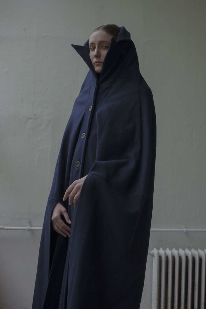 – árulta el a fiatal designer. És valóban: a tömeg, az anyag súlyának nehézkedése már első pillantásra is érződik a sátorszerű, amorf alakon. Különös felvetése a koncepciónak, hogy a konvencionálisan a vállakra háruló anyagsúly ez esetben a fejre összpontosul.